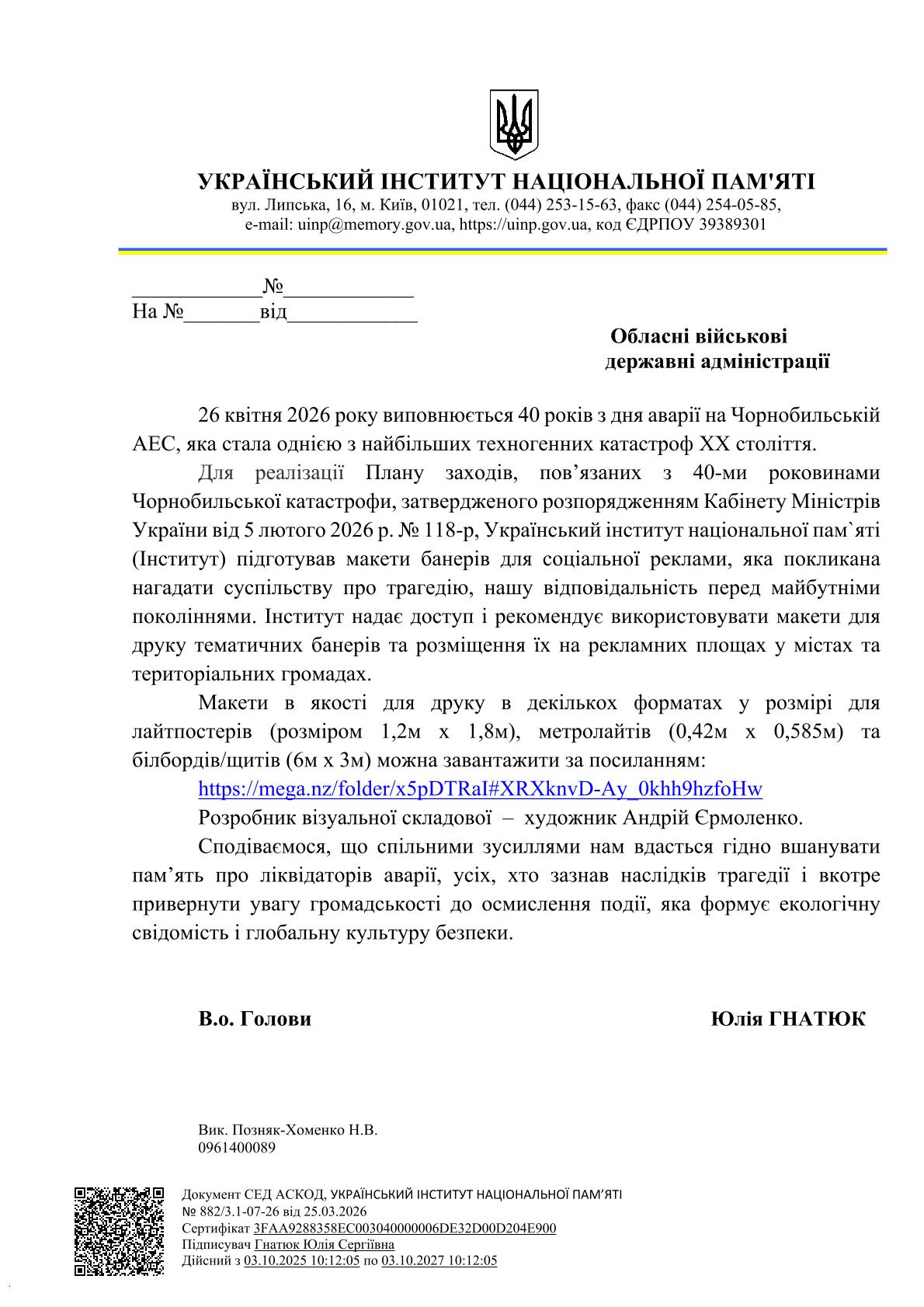 Просимо керівників Чорнобильських організацій розглянути можливість розміщення на банерах, білбордах плакати до 40-х роковин Чорнобильської катастрофи згідно п.10 Постанови Верховної Ради України "Про вшанування учасників ліквідації наслідків аварії на Чорнобильській АЕС та про заходи, пов'язані з 40-ми роковинами Чорнобильської катастрофи"